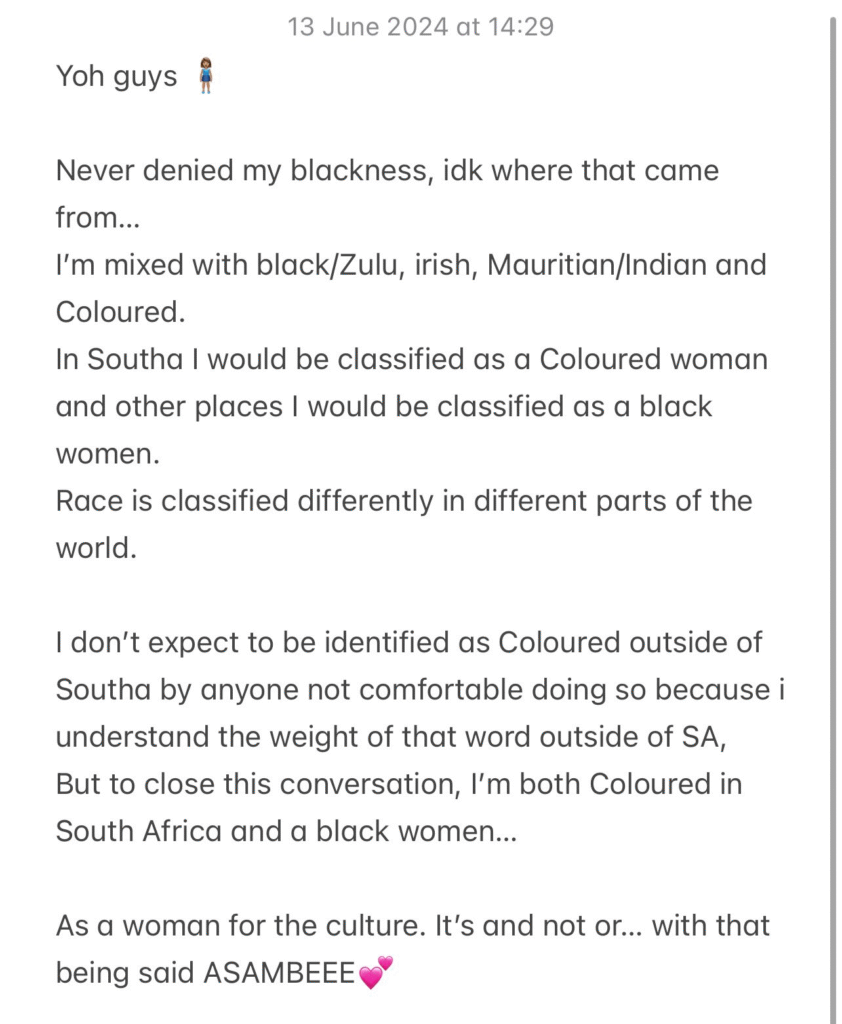 In one of her first international cover stories, Cosmopolitan, Tyla is quoted as saying, “I never said I am not Black. It’s just that I grew up as a South African knowing myself as Coloured. And now that I’m exposed to more things, it has made me other things too. I’m also mixed-race. I’m also Black.” This statement predates the backlash and her June 2024 interview with The Breakfast Club.